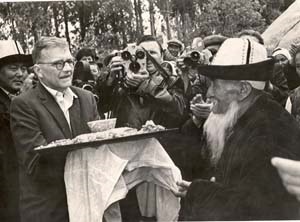 Орус, кыргыз шайырлары кезеги менен биринен сала бири концерт берип жатты. Кезек 78 жаштагы улуу комузчу карыя Ыбырай Тумановго да келди. Ал өзүнүн залкар кайрыктарга бай “Жаш тилек” аттуу күүсүн черте баштады. Шостакович менен Мурадели карыя комуздан көздөрүн алышпай өзгөчө таңдануу, артыкча суктануу менен угуп жатышты. Ыбыкем күүсүн чертип бүттү да Шостаковичти карап: “Мен улуу композитор Шостаковичти өз көзүм менен көрдүм... Эми арманым жок...Биз андан кыргыздар жөнүндө музыка жазуусун суранабыз”, – дегенде сандаган угуучулар дүркүрөтө кол чабышып, коштоого алышты. Концерттин соңунда Шостакович Ыбыкеме басып келип учурашып, өтүнүчүн аткарарын айтты. Орус музыкасынын он күндүгүнүнүн салтанаттуу жабылышы азыркы Абдылас Малдыбаев атындагы опера жана балет театрында өттү. Ошондо композитор Д.Шостакович сөз алды.