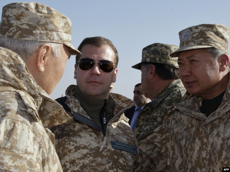 Н. Назарбаев, Д. медведев, Э. Рахмон жана К. Бакиев ЖККУнун аскерий оюну учурунда пикир алмашууда. 16-октябрь.