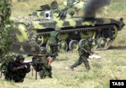 Тажик жоокерлер Россиянын 201-дивиязиясы менен чогуу аскерий машыгуу өткөрүүдө. Тажикстан. 18-октябрь 2002-ж.