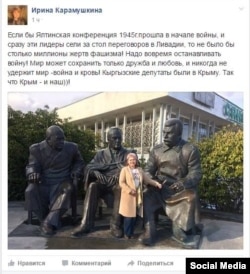 Депутат Ирина Карамушкина 24-мартта Фейсбуктагы баракчасына сүрөтүн жарыялап, "Кыргыз депутаттары Крымда болду. Демек Крым – биздики дагы” деген пикирин калтырган.