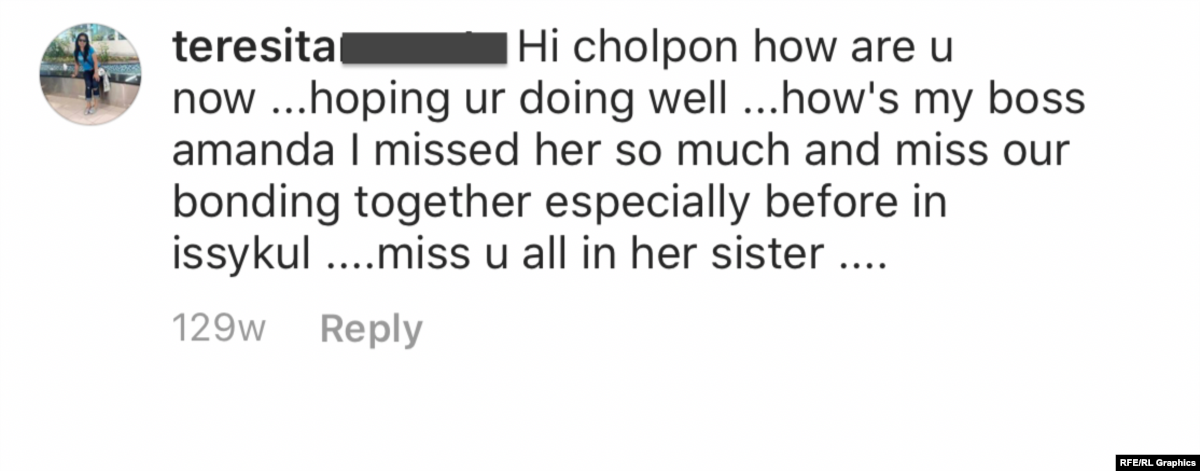 2017-июнда Teresita Тургунова менен сүрөткө көп түшкөн Чолпон Медерованын  «Инстаграмдагы» постунун алдына комментарий калтырган (азыр Медерова ал постту өчүрүп салган). Teresita «Аманда кожойкесин» сагынып жатканын жазып, анын иштери кандай деп сурайт: